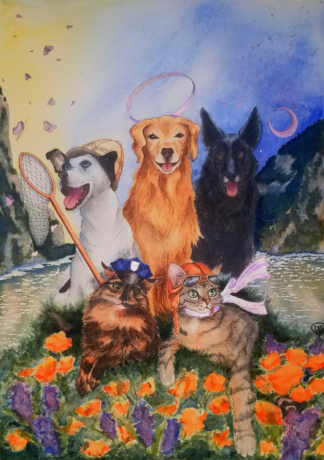 ”Cornell Family Pets Portrait.”Watercolor, Coliro Iridescent watercolor, and pen. (Commission for a wedding gift.)